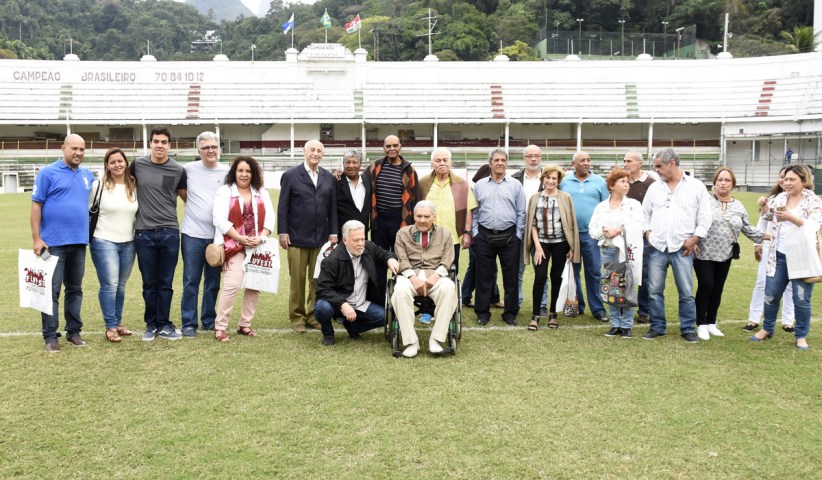 Duque (à esquerda), Emílson Pessanha (ex-jogador e supervisor do Fluminense, ao centro) e o autor deste blog (à direita) na homenagem aos campeões de 1973 realizada em 2013
